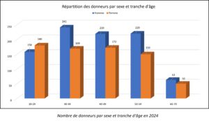 La répartition des donneurs par tranche d’âge reste homogène jusqu’à 60 ans, avec une prépondérance des donneurs de sexe masculin à partir de 30 ans