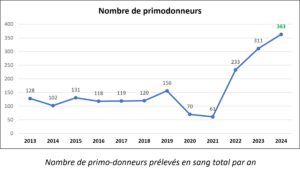 • Recrutement des premiers dons en hausse avec 363 primo-donneurs en 2024, soit 15% des dons réalisés